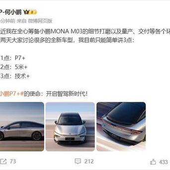对此,小鹏汽车董事长何小鹏在微博回应表示,自己最近在全心筹备小鹏MONA M03的细节打磨以及量产、交付等各个环节,针对这两天大家讨论很多的全新车型,何小鹏透露了3点:P7+;5米+;技术+。